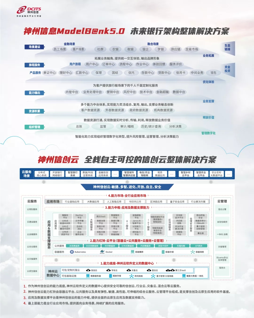 ModelB@nk5.0和神州信创云是神州信息在2021技术年会上最新发布的前沿技术成果。旨在以大数据、人工智能、区块链等数字技术为驱动,赋能金融科技创新及各行业数字化转型,服务实体经济,践行数字中国使命。