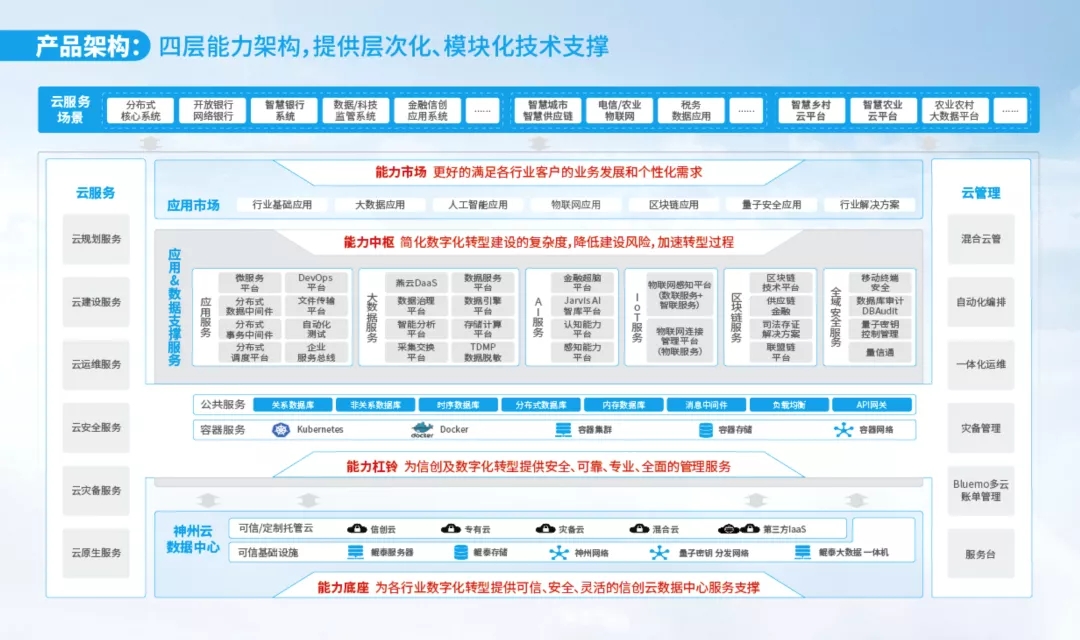 神州信创云作为全栈自主可控的信创云整体解决方案,提供从整体规划到实际建设的全生命周期服务。内建四层能力架构,提供层次化、模块化技术支撑:能力底座为各行业数字化转型提供可信、安全、灵活的信创云数据中心服务支撑;能力杠铃为信创及数字化转型提供安全、可靠、专业、全面的管理服务;能力中枢简化数字化转型建设的复杂度,降低建设风险,加速转型过程;能力市场更好的满足各行业客户的业务发展和个性化需求。