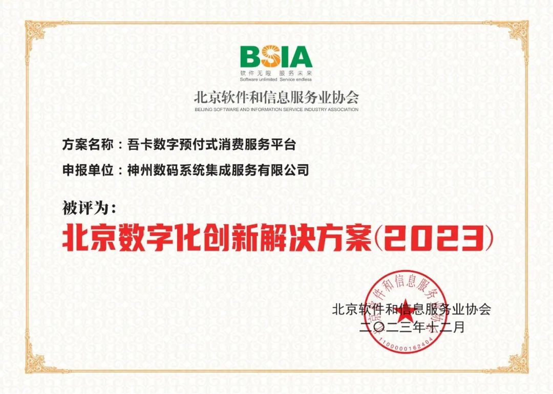 北京软件和信息服务业协会近日授予神州信息“北京数字化服务商(2023)”荣誉称号。神州信息推出的“吾卡数字预付式消费服务平台”获评“北京数字化创新解决方案(2023)”。